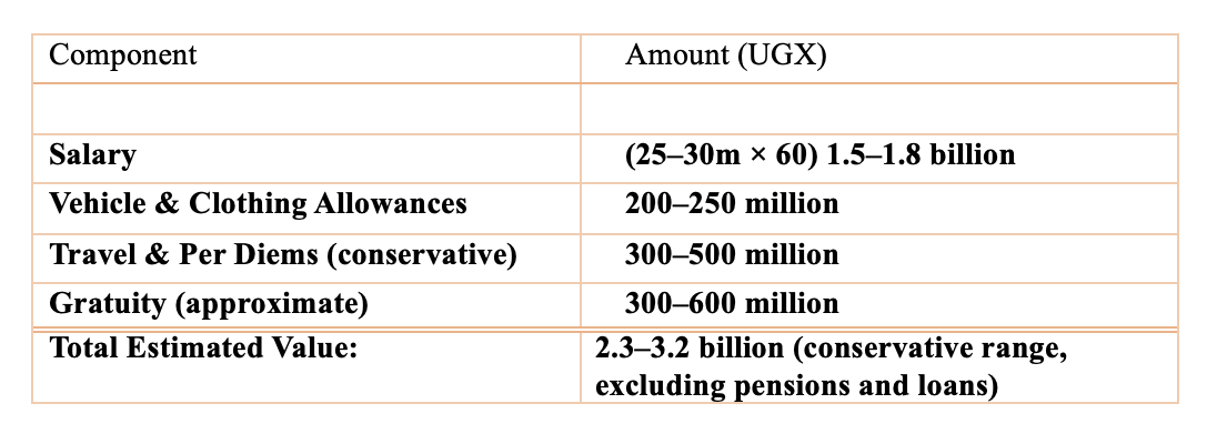 In Uganda, parliamentary service offers a legally sanctioned, economically transformative, and politically insulated position. Five years in Parliament can materially surpass thirty years of comparable civil service in economic terms. Three terms can secure lifetime wealth, security, and influence. Until benefits are harmonised with national standards and linked to performance, Parliament will remain a temporary office with permanent rewards, lawful yet democratically detached.