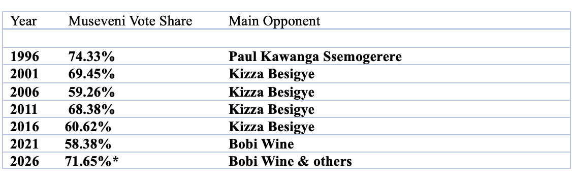 Accordingly, this analysis does not assume equivalence between Museveni’s early and late electoral performances. Rather, it interrogates whether numerical similarities in vote share can meaningfully sustain claims of continuity in popularity, or whether they instead reflect structural transformations in power, political competition, and the conditions under which consent is expressed.